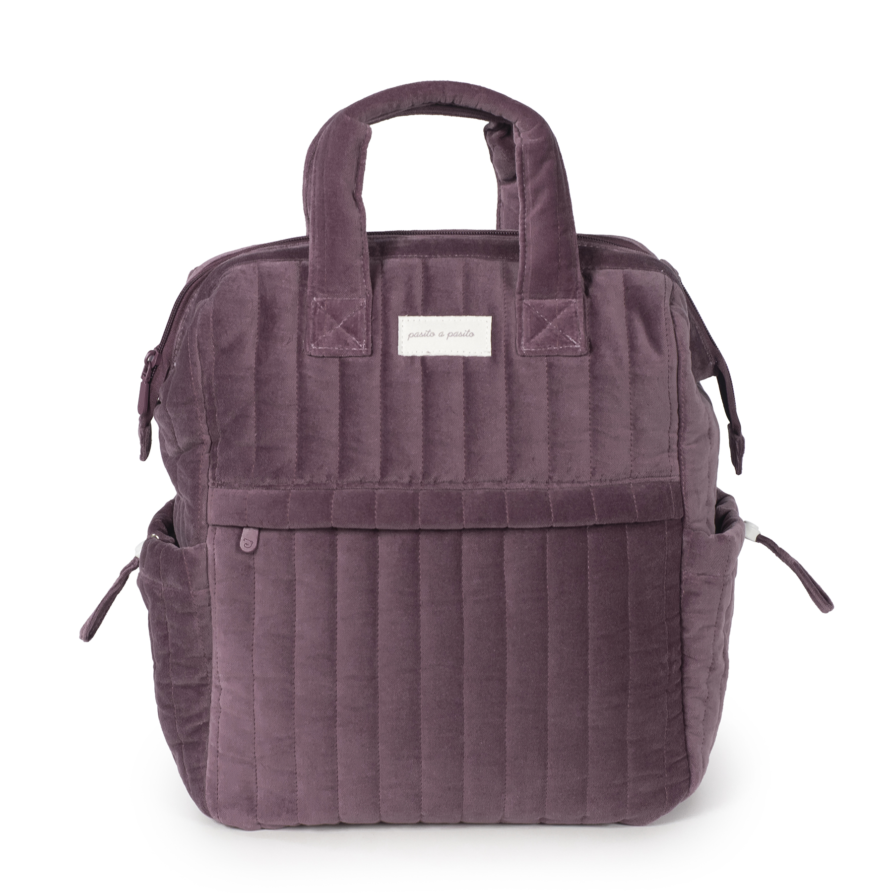 Стилски и практичен мајчински ранец Cherry Velvet од Pasito a Pasito, изработен од 100% памучен сомот. Има водоотпорен слој, голем капацитет, повеќе џебови, странични прегради за шишиња и вклучена подлога за пресоблекување. Може да се носи на грб, во рака или да се прикачи на количка. Совршен за секојдневна употреба.