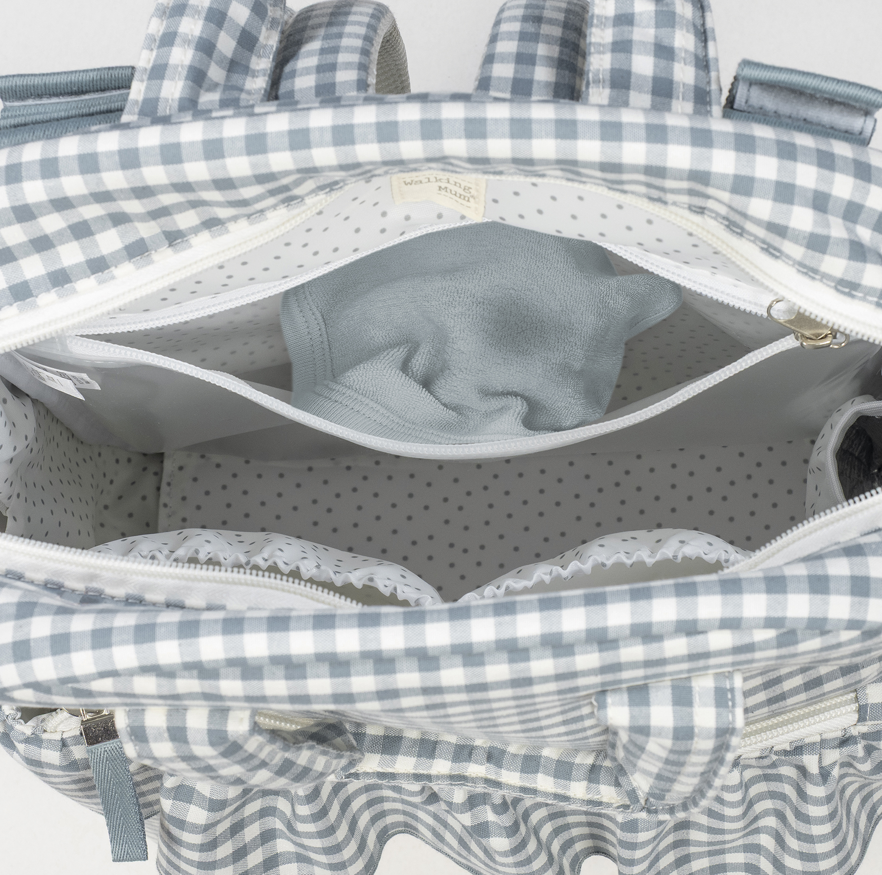 Ранецот Praliné Vichy Matcha од Walking Mum има 3 надворешни и 4 внатрешни џеба за организација и лесен пристап до сите работи. На надворешната страна има преден џеб со патент и два странични џеба за шишиња. Внатре има ламиниран џеб за влажна облека, термо-џеб за шишиња и два дополнителни џеба за потребните работи. Вклучена е и подлога за пресоблекување.