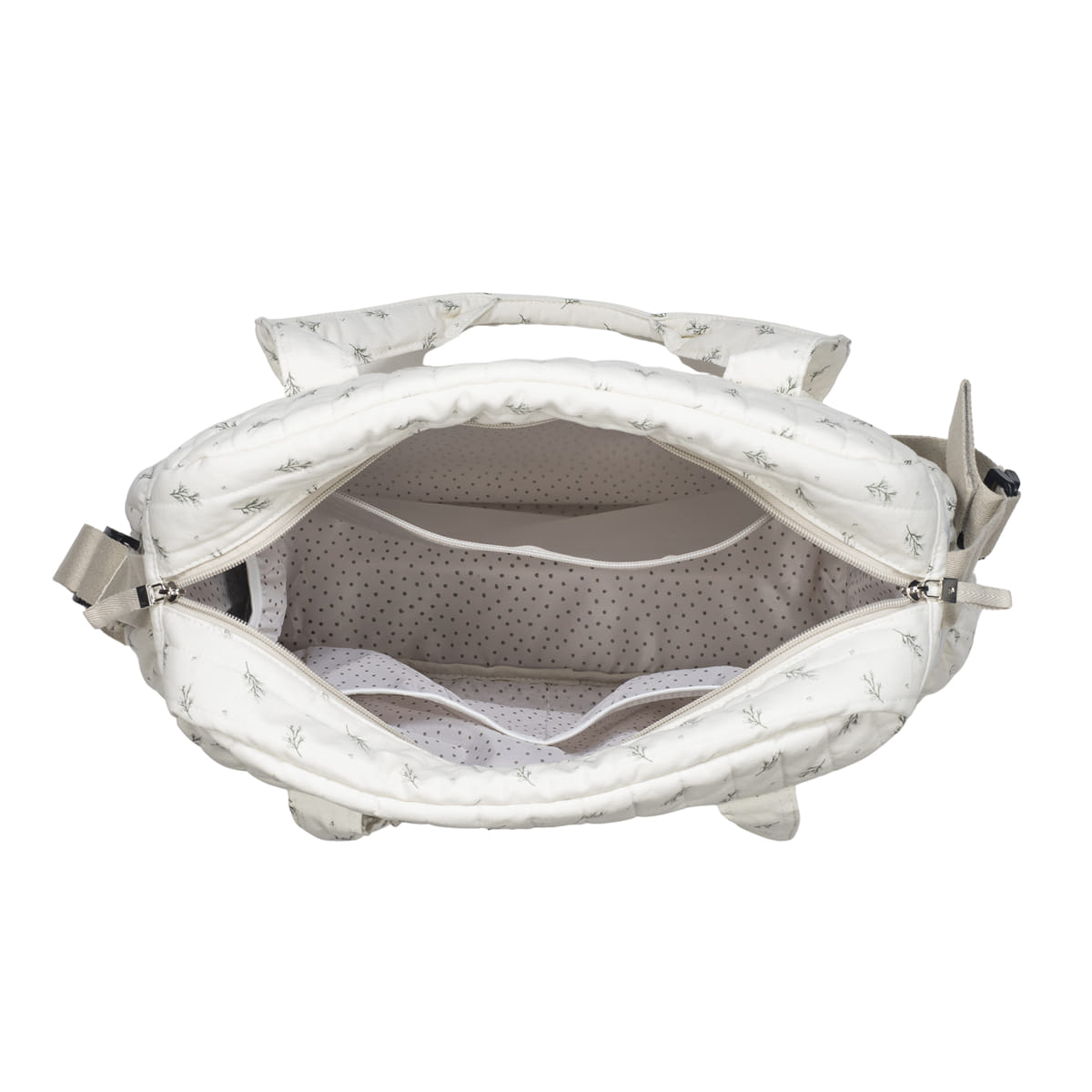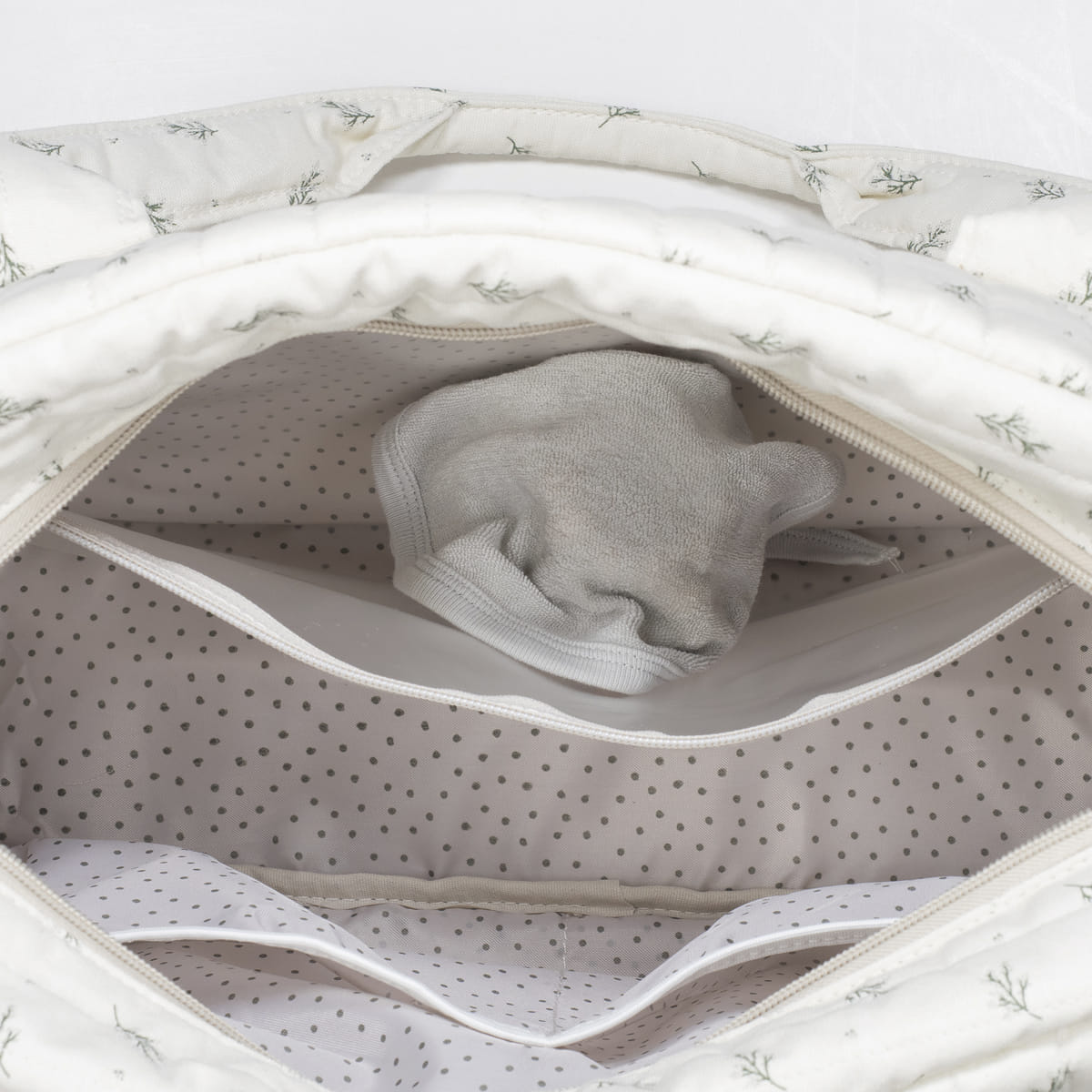 Има термо џеб, џеб за влажна облека, странични џебови и подлога за пресоблекување.