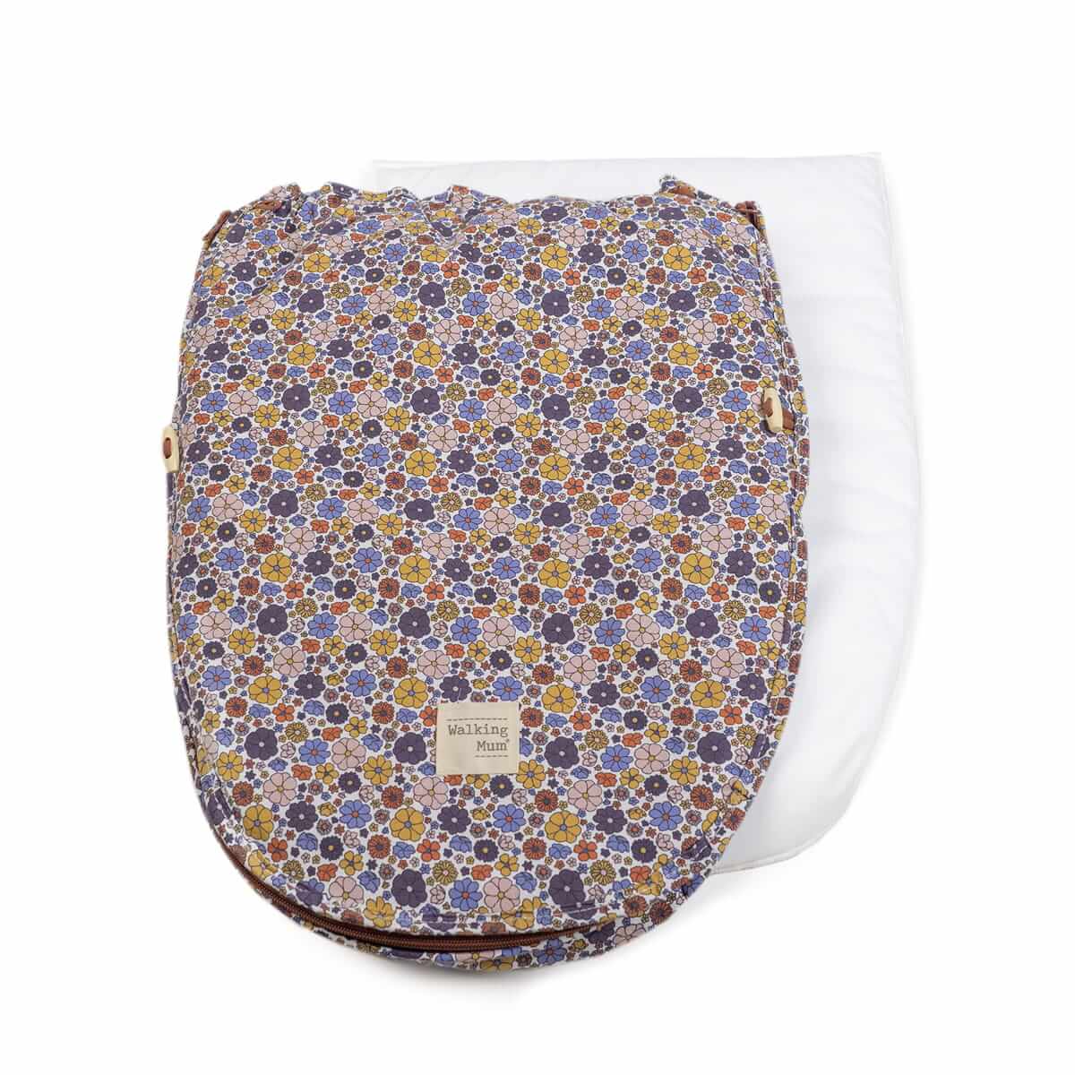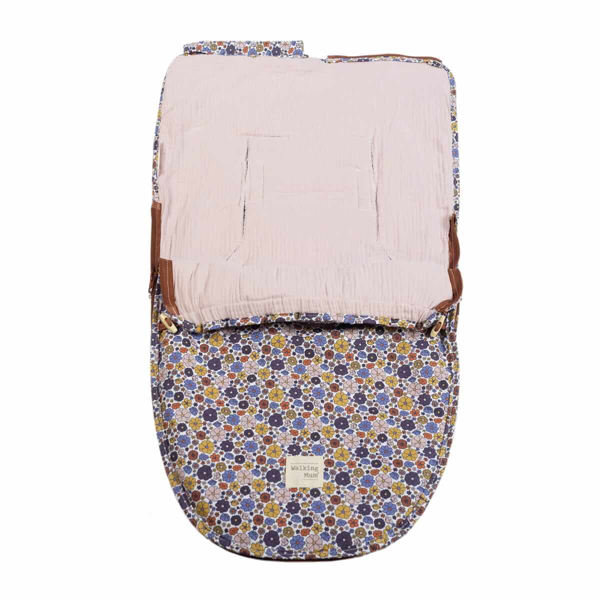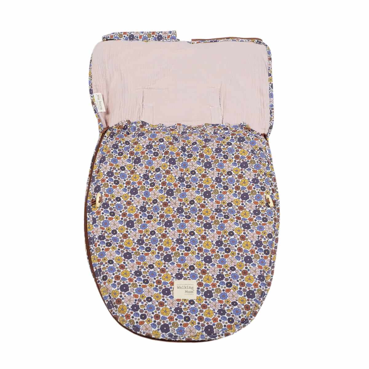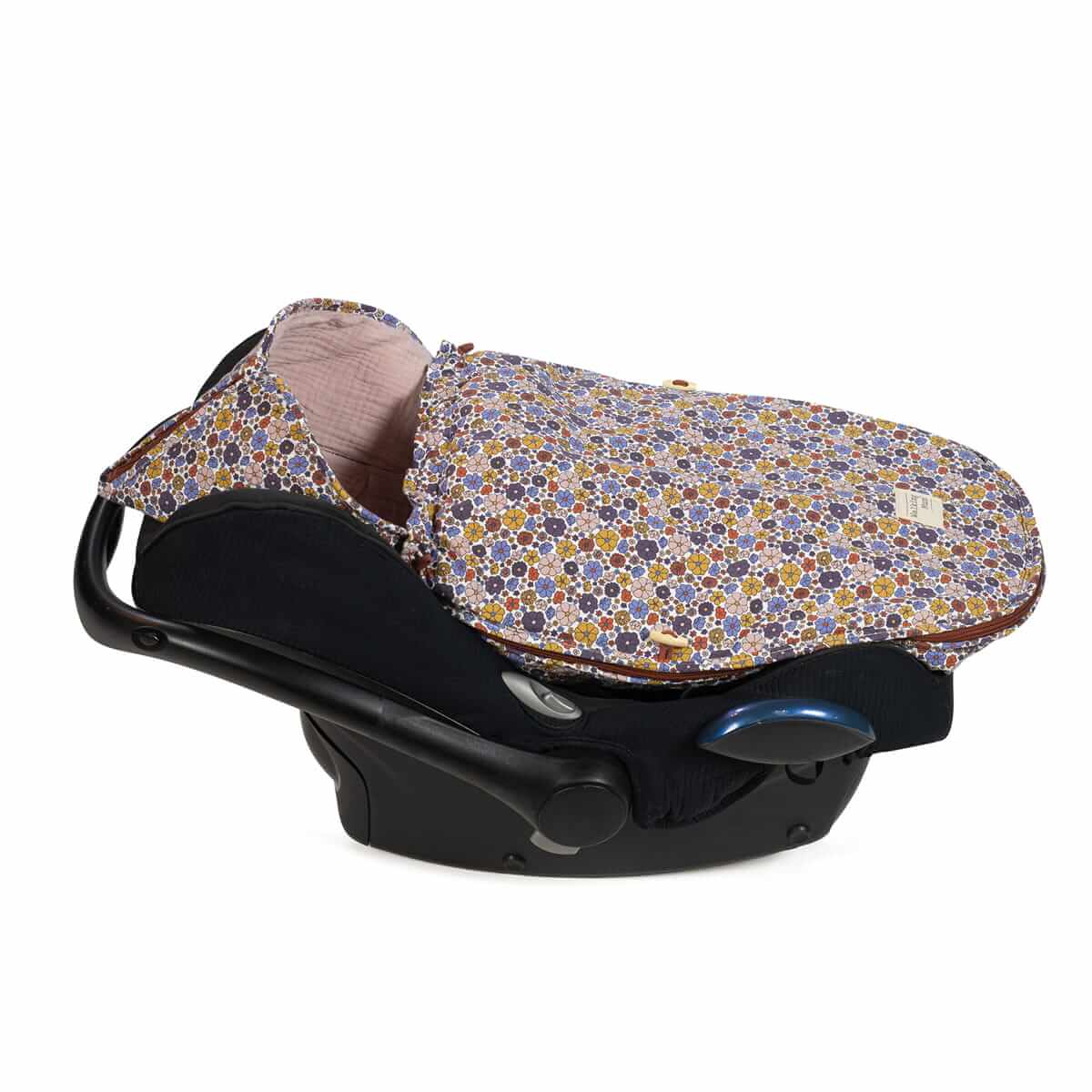 A cover for a carrycot and/or car seat with a sleeping bag in multicolor floral print, ideal for spring and autumn. Made with an anti-perspiration back that prevents sweating and protects the seat. The padded inner lining is removable. Designed with multiple belt openings (buttons) and fits almost all Group 0 car seats.